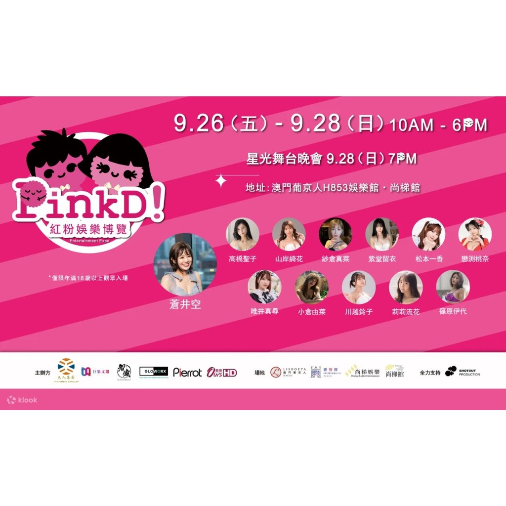 由活動代言人日本天后蒼井空領軍 多達 40 位來自日本的最新及人氣男女優 PinkD!《紅粉娛樂博覽》現場展現她 / 他們的動人魅力,熱潮將席捲中港澳,絕對是您今年最火熱的首選!作為近年大灣區最大的娛樂博覽暨女神男神見面祭之一,PinkD! 將聯同男女優及參展商為廣大粉絲帶來一場視覺與感官的饗宴,會場設有女優一對一粉絲互動、可體驗電影場景的主題房間、華麗的大型舞台演出及專屬星光舞台; 女性向男神一對一互動區以及舞台活動。邀請您一起體驗大灣區最大B2C 娛樂博覽之一,享受她們的攝人魅力,度過難忘時光!